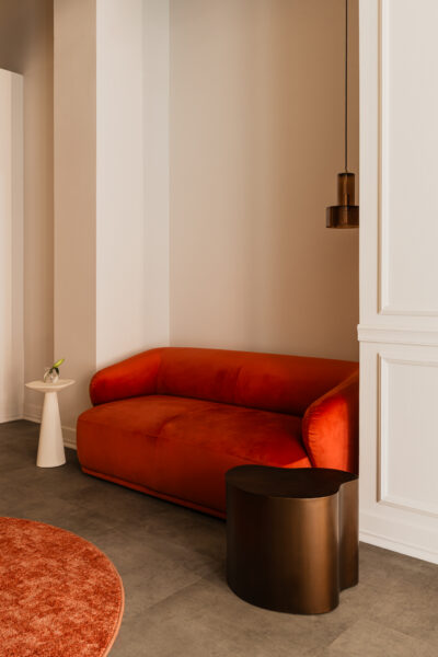 Wnętrze salonu to harmonijne połączenie surowych materiałów, takich jak szkło, metal i beton, z miękkimi tkaninami i designerskimi meblami o prostych, ale niebanalnych formach. To zestawienie surowości z delikatnością tworzy przestrzeń, która jest jednocześnie intrygująca i przytulna. Kluczowym elementem stał się również nasz flagowy kolor – palona siena. Ten naturalny pigment, od wieków wykorzystywany przez artystów, dodaje wnętrzom ciepła i głębi.