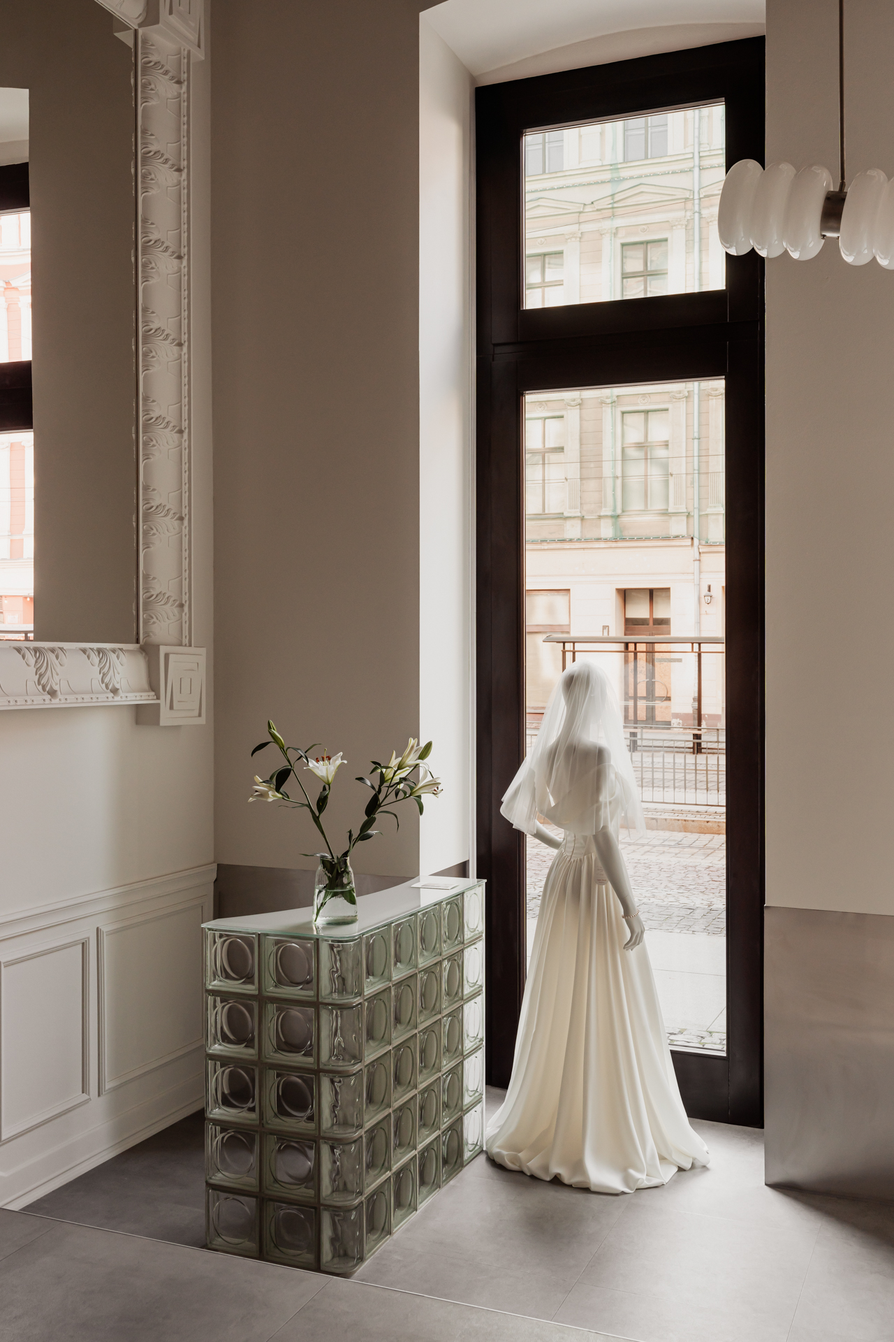 Dużą inspiracją przy tworzeniu koncepcji wnętrz stała się XIX-wieczna, odrestaurowana kamienica, w której postanowiłyśmy otworzyć nasz salon. Jej klasycystyczna fasada, pełna elegancji i historycznego uroku, doskonale współgra z nowoczesnym designem, który wprowadziłyśmy do środka. Salon Sapfo Bridal znajduje się w jednym z najpiękniejszych zakątków Wrocławia – tuż przy Operze Wrocławskiej, Teatrze Lalek oraz słynnym hotelu Monopol, gdzie niegdyś gościli tacy znamienici artyści jak Pablo Picasso czy Marlena Dietrich. To otoczenie kultury i historii stało się dla nas punktem wyjścia do stworzenia przestrzeni, która łączy w sobie klasyczny sznyt z nowoczesną prostotą.