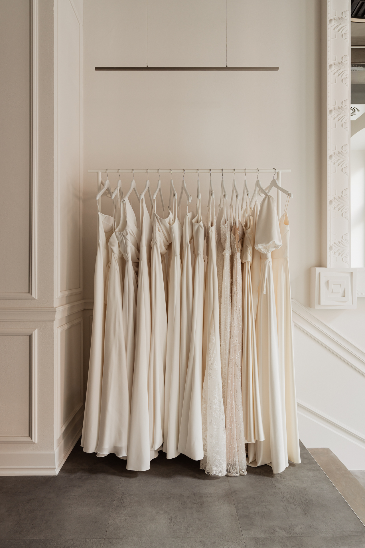 Kiedy myślimy o salonach sukien ślubnych, często wyobrażamy sobie przestrzeń wypełnioną tiulem, kryształami i złotymi dekoracjami. Podobna estetyka nigdy nie była nam jednak bliska. Od samego początku chciałyśmy zerwać z tym rozpowszechnionym wizerunkiem, stawiając na własne poczucie piękna i oryginalność. Wiedziałyśmy, że nasze miejsce musi zachwycać nie tylko unikatowymi projektami sukien ślubnych, ale także wyjątkowym designem wnętrz. Do dziś z uśmiechem wspominamy burzę mózgów, w której uczestniczyłyśmy wraz z utalentowaną projektantką wnętrz, Małgorzatą Wojtyczką, jej asystentką Niną Korczowską oraz Katarzyną Gwoździk, graficzką, która stworzyła dla naszej marki niebanalną identyfikację wizualną. To dzięki ich kreatywności i naszym wspólnym wizjom powstało miejsce, z którego dziś jesteśmy bardzo dumne.